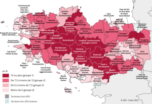 En témoigne également la note de l’Insee Bretagne sur le sujet : « Des logements vacants plus fréquents dans les territoires moins dynamiques », qui met en valeur, comme le souligne la cartographie ci-dessous, les différences de taux de vacances entre le centre Bretagne et la côte.